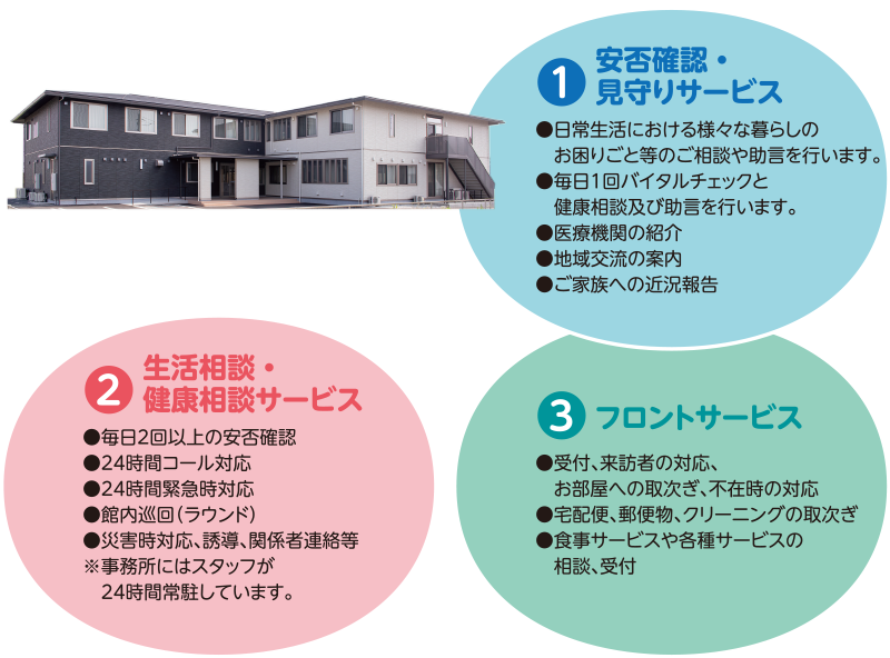 3つの生活支援基本サービスは、すべての入居者様に提供する日常的なサービスで、以下の内容となります。